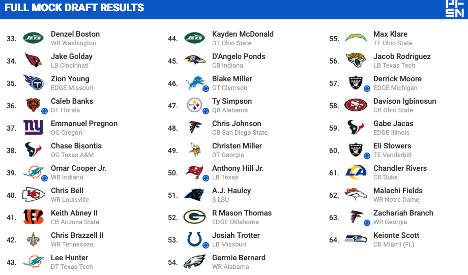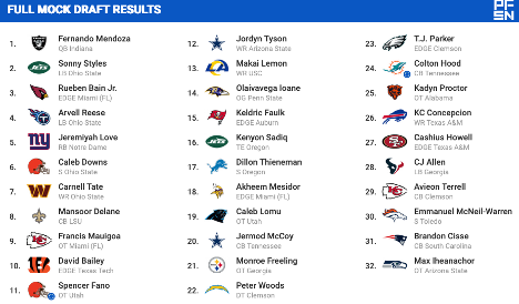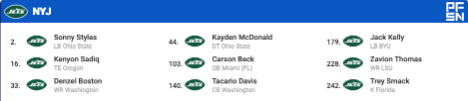 We did a full seven-round draft using the “consensus player list” that combines data from The Athletic, ESPN, PFF, and PFSN. The simulator made picks for 31 GMs. I made the picks for Aaron Glenn and Darren Mougey.