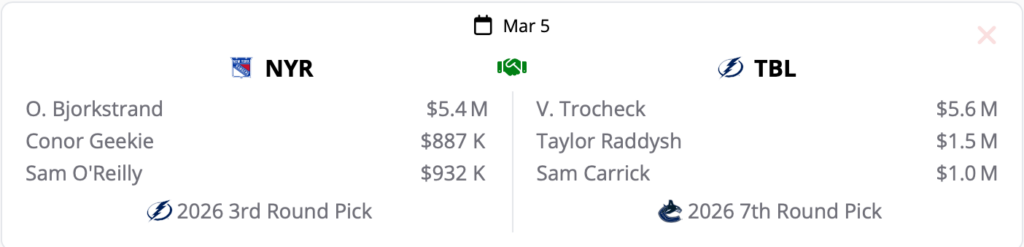 Tampa Bay has been on the periphery of Trocheck rumors, but GM Julien Brisebois is one of the most aggressive GMs in the NHL. In this deal, he would be dealing 21-year-old C Conor Geekie and 19-year-old C Sam O’Reilly. The Rangers would not get a first-round pick in this trade, but they would get two of the Lightning’s three top prospects.