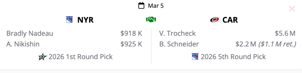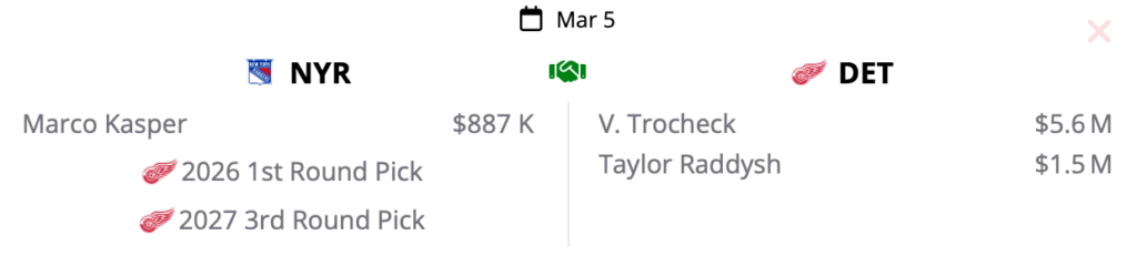 However, I’ve come around. Since the Rangers have three centers born in 1993 — JT Miller, Trocheck, and Mika Zibanejad — it makes sense to get younger down the middle. Plus, Trocheck’s 200-foot game and reasonable $5.652m contract make him very attractive.