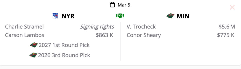The rumor over the last few weeks is that Wild GM Bill Guerin has an offer sitting on Rangers’ GM Chris Drury’s desk featuring center prospect C Charlie Stramel and the Wild’s 2027 first-round pick. IF Guerin follows my lead and makes the following enhancements, this mock trade could be the winning bid. Stramel, 21, has 41 points through 32 games this season at Michigan State University. D Carson Lambos, 23, is completing his third full season in the AHL.